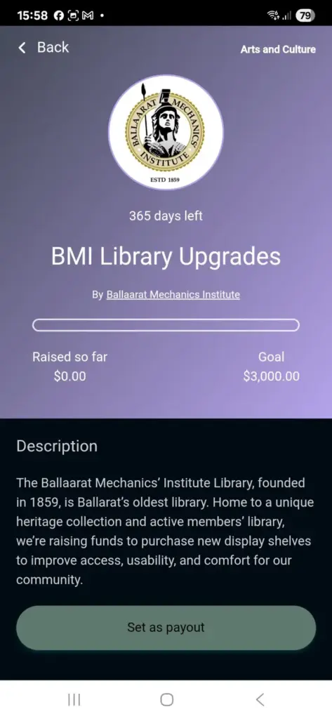 Anyone can now select the ‘Ballaarat Mechanics’ Institute’ from the charities list and donations will flow to our account, once the campaign is completed we will receive donated funds.