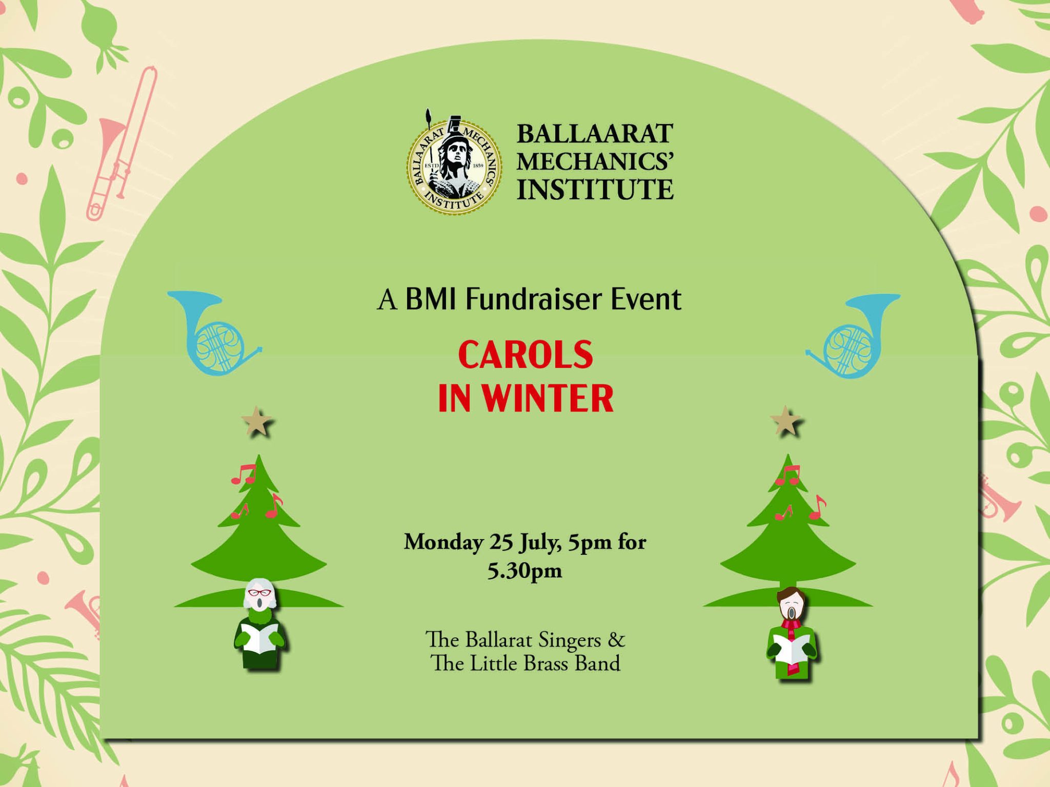 BMI Fundraiser | Carols in Winter | Ballarat Singers & Little Brass Band Jul 25 5:00 pm - 7:00 pm BMI Fundraiser | Carols in Winter | Ballarat Singers & Little Brass Band $10.00